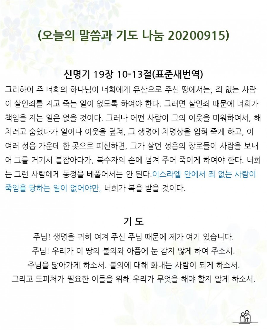 9월 15일(화) 오늘의 말씀과 기도 신명기 19장 10-13절 우리에게 도피성은? 세워질 수 있을까?